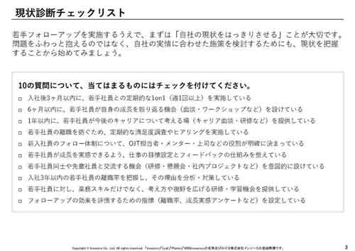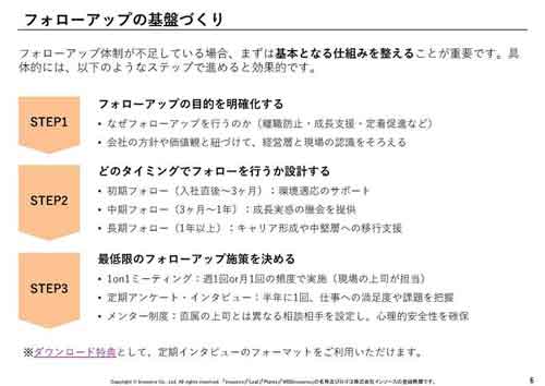 本資料では、そうした課題に対して、現状の振り返りから施策設計、実行のポイントまでを一冊にまとめました。現場ですぐに活用できる定期インタビューフォーマットも付属。フォローアップ体制を見直したい方、新たな手法を検討している方に最適です。