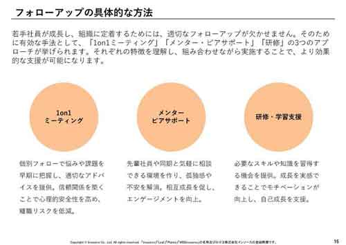 - 1on1、メンター制度、OJT、研修など主要手法の活用ポイント