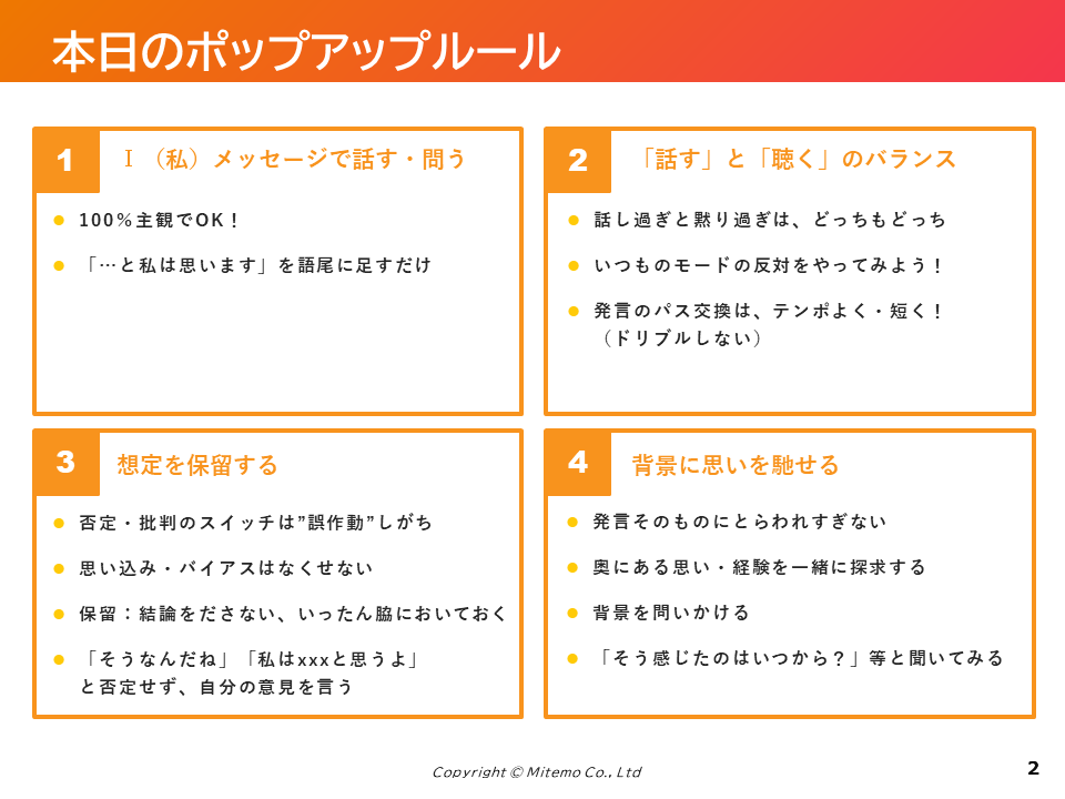 - 【ワーク】「得られた発見」と「明日からできる行動」について話し合う